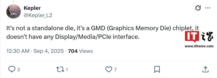 GMD的全称为GraphicMemoryDie,仅包含核心的计算单元和显存控制部分,无显示引擎、媒体引擎、PCIe界面等单元。