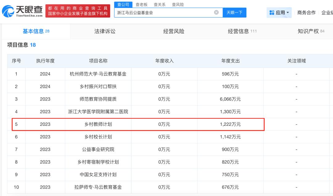 天眼查显示,成立于2014年的马云公益基金会,每年会在“乡村教师计划”投入上千万元,仅2023年这一金额就达到1222万元。