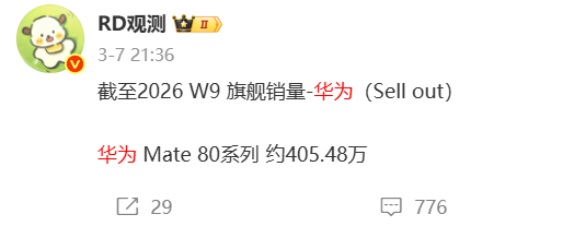 CNMO注意到,根据博主“RD观测”3月7日发布的数据,截至2026年第9周,华为Mate 80系列累计销量约405.48万台。这意味着,华为Mate 80系列自2025年11月28日开售以来,仅用14周便突破400万大关,平均周销量近29万台。
