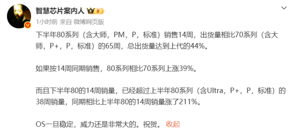 【CNMO科技消息】3月9日,博主“智慧芯片案内人”统计并发布了华为Mate 80系列与往代旗舰的销量对比数据。数据显示,截至销售第14周,华为Mat e80系列总出货量已达到上代Mate 70系列65周总销量的44%。若按14周同期对比,华为Mate 80系列销量较Mate 70系列上涨39%。同时,华为Mate 80系列的14周销量已超过华为Pura 80系列(含Ultra、Pro+、Pro、标准版)38周的销量。若按14周同期对比,华为Mate 80系列相比Pura 80系列暴涨211%。