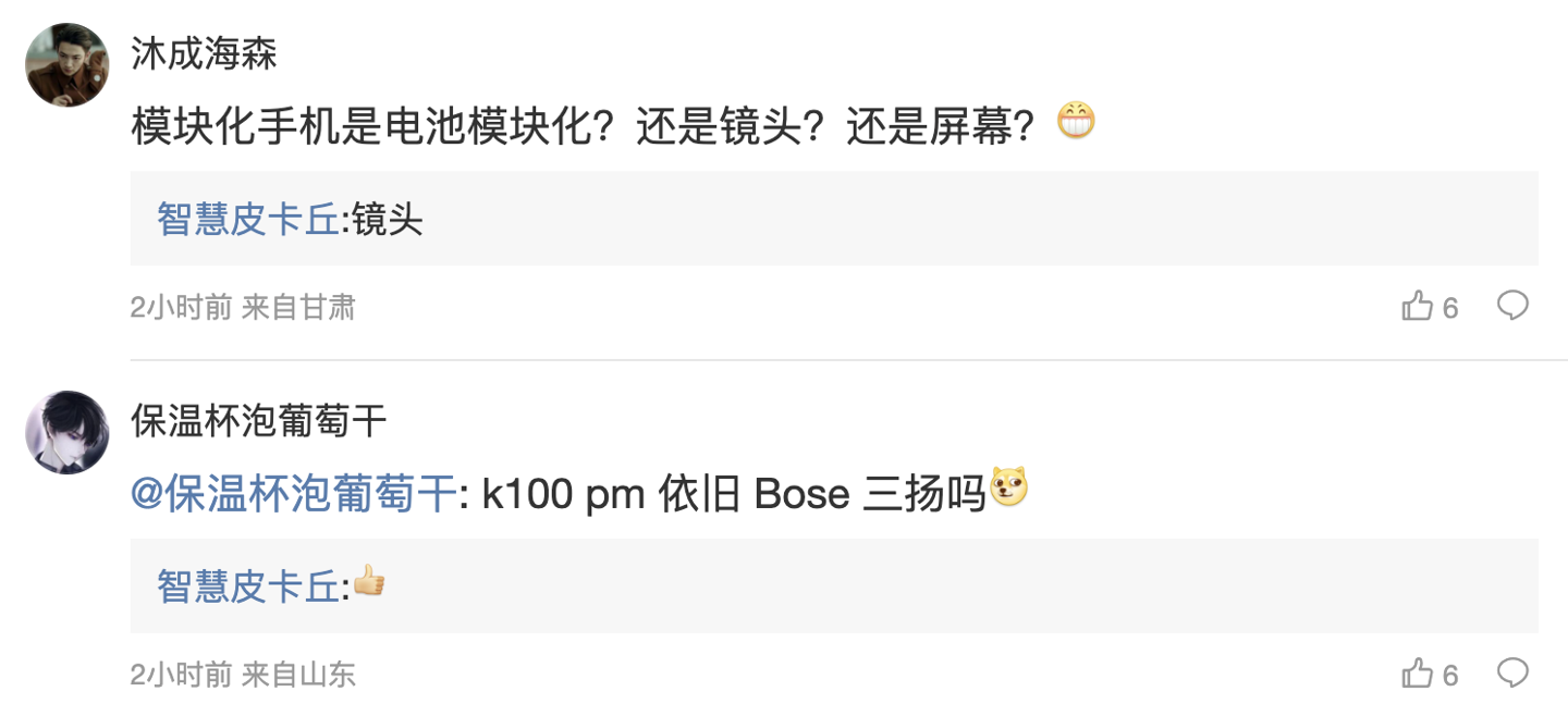 后续有用户在评论区询问:“模块化手机是电池模块化?还是镜头?还是屏幕?”,博主回复道:“镜头”;另一名用户则询问道:“k100 pm 依旧 Bose 三扬吗 [狗头斜眼]”,博主则回复道:“[大拇指]”。