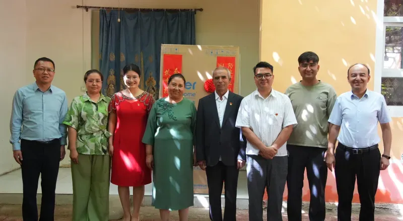 洛浦县委书记余新意(左一)和县长依布拉英·阿尔甫(右一)与新人家庭成员合影。通讯员 迪力亚尔·阿卜力克木摄
