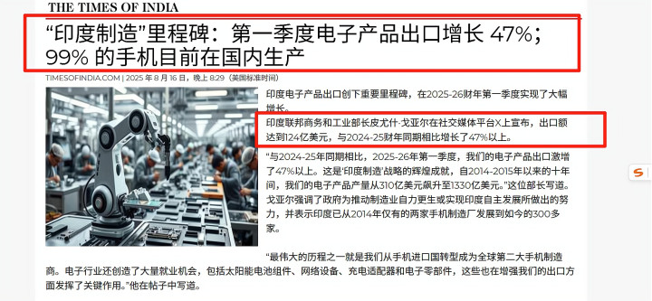 不能忽略一个关键事实:印度的手机制造业虽实现本土化组装,但核心技术及关键零部件仍高度依赖进口,